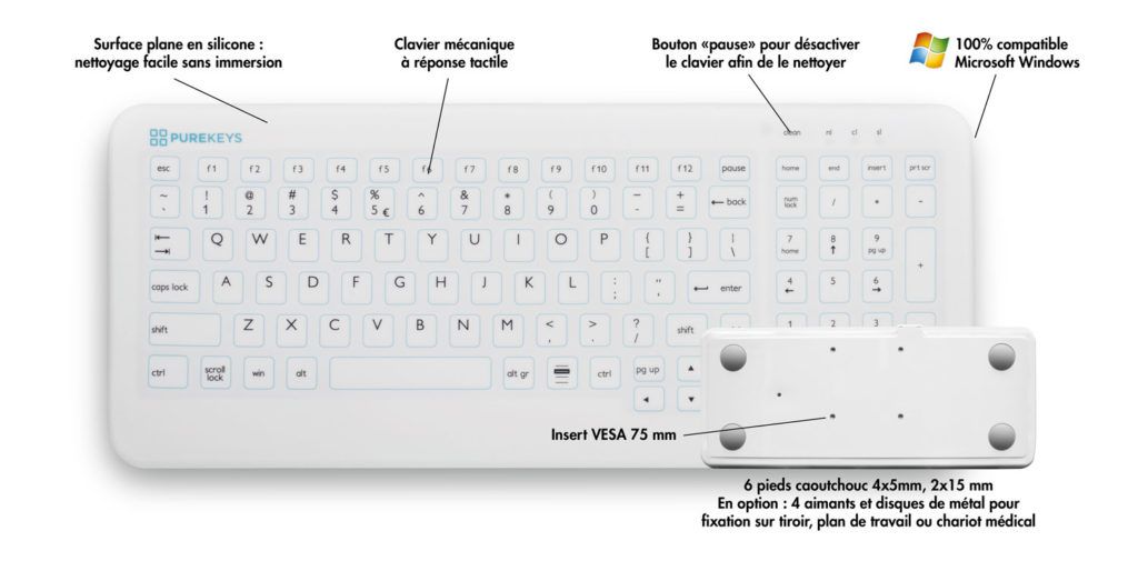 PUREKEYS peut être nettoyé en quelques secondes avec une lingette désinfectante aux normes hospitalières.
