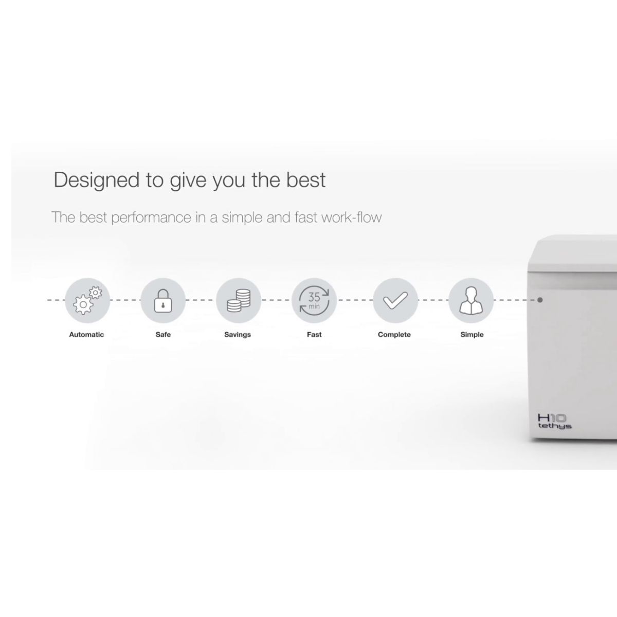 Tout ce dont vous avez besoin, rapidement. Un cycle complet en seulement 35 minutes. Le Tethys H10 Plus diminue drastiquement les délais de lavage et de désinfection, en les réduisant de moitié par rapport à ceux d'un processus traditionnel. L’intégration des diverses phases dans un seul dispositif accélère le cycle opérationnel et réduit les nombreuses activités manuelles, valorisant ainsi votre temps.